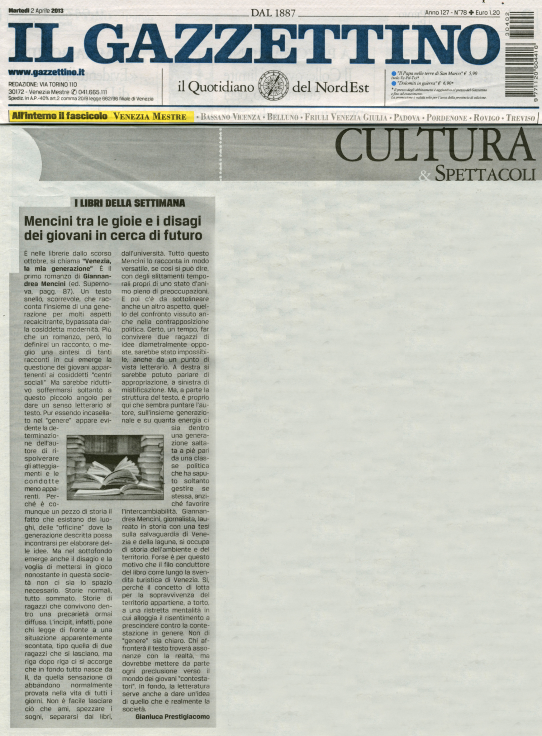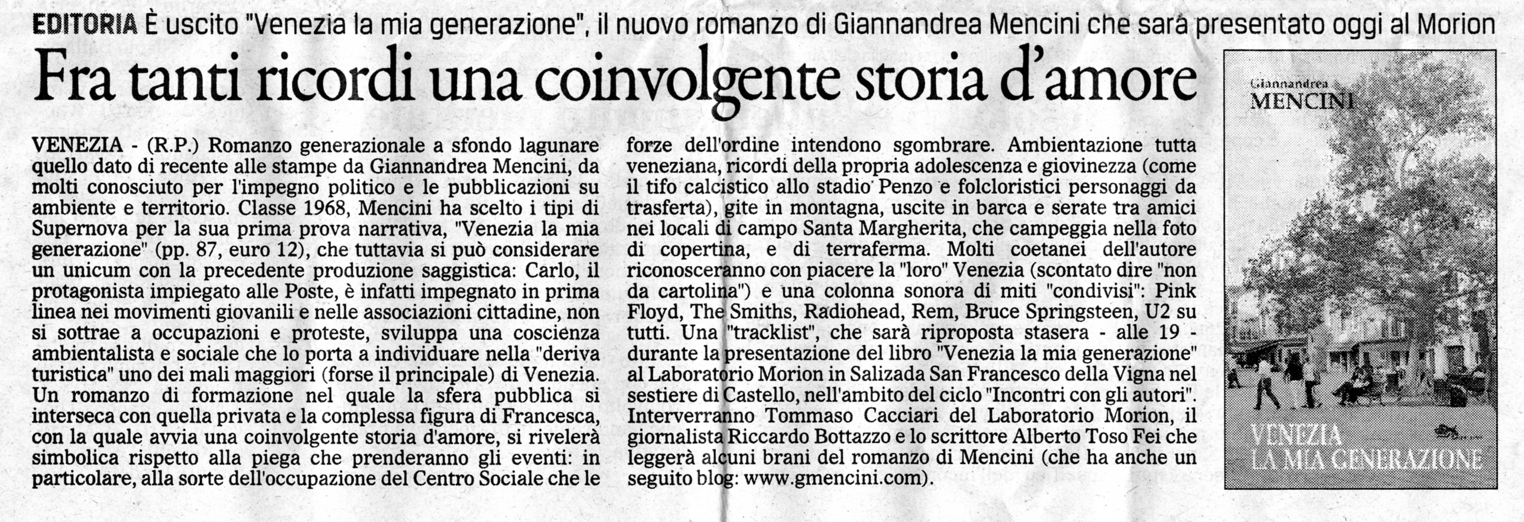 "...molti coetanei dell'autore riconosceranno con piacere la "loro" Venezia (scontato dire "non da cartolina") e una colonna sonora di miti "condivisi": Pink Floyd, The Smiths, Radiohead, Rem, Bruce Springsteen, U2 su tutti" - Il Gazzettino