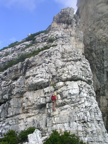 Lungo la ferrata quindi si alternano tratti di sentiero, cenge, terrazzi inclinati esposti con salti di roccia sempre attrezzati e ben gradinati. Dalla cima, raggiunta dopo circa 2 ore di ferrata intervallata da passaggi di sentiero, bellissimo panorama.