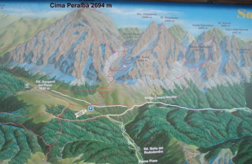 Alla cima si può salire attraverso il sentiero ovest che parte del rif. Sorgenti del Piave (situato alla fine della valle Sesis che può essere tranquillamente risalita in macchina prendendola da Cima Sappada seguire indicazioni) e sale lungo la cresta verso la Val Visdende, itinerario bello ma lungo ed esposto in parte. Oppure attraverso la via normale Giovanni Paolo II, in onore del papa che segui questa via il 20 Luglio 1988 quando, a piedi, salì sulla vetta del Peralba. Questa via è la più frequentata, bella, più breve con difficoltà contenute ma con un canalino attrezzato da superare non banalissimo, più difficile in discesa. Infine si sale direttamente attraverso la ferrata Sartor che si prende poco sopra il rifugio Calvi e visibile dal rifugio stesso. Noi siamo saliti per la via ferrata e scesi per la normale Giovanni Paolo II. Un giro che consiglio vivamente.Si attraversa in macchina la verde valle Sesis citata in precedenza e si parcheggia poco prima del rif. Sorgenti del Piave ove le indicazioni segnalano la mulattiera per il rif. Calvi. In circa un’ora si raggiunge il rifugio Calvi (alt. 2164 m) attraverso una comoda mulattiera in costante moderata salita. Il rifugio si trova in un luogo suggestivo fra il Peralba e le pendici del Chiadenis. Dal Calvi si sale in direzione passo Sesis e poco prima del passo si taglia sulla sinistra seguendo le indicazioni per la ferrata Sartor. Presto si arriva a un primo pezzo di corda non difficile che porta all’inizio vero della ferrata indicato da una targa e dalla presenza di una breve scala metallica seguita da lunghi tratti attrezzati con funi d'acciaio. La ferrata che risale una parete in moderata pendenza non è difficile direi sostanzialmente facile con alcuni passaggi di media difficoltà. Mai in forte esposizione. Attenti alla caduta sassi. Per raggiungere la croce della cima bisogna, a conclusione del sentiero attrezzato, arrampicarsi un po’ (I grado) lungo un tracciato un po’ faticoso. Panorama dalla cima mozzafiato. Ritorno attraverso la citata via normale (sentiero n. 131-132) che si prende ad est seguendo la cresta dopo la croce della cima (segnale rosso e omini di roccia). Discesa relativamente facile escluso un canalino attrezzato con corda un po’ ripido leggermente più difficile soprattutto in discesa come ricordavo prima. Si raggiunge in discesa il passo Sesis e poco dopo il rifugio Calvi. Salita 1 h e 45 circa ( dal rifugio) e discesa fino al rifugio 1 h e 30 minuti.
