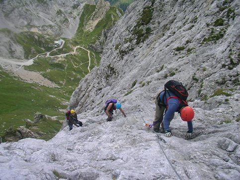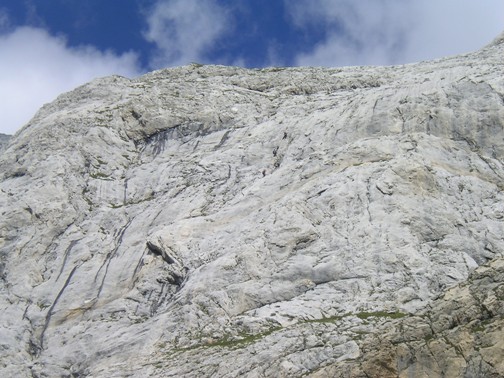Foto 4: la parete del Peralba ove si sviluppa la ferrata Sartor (con tre escursionisti in salita)